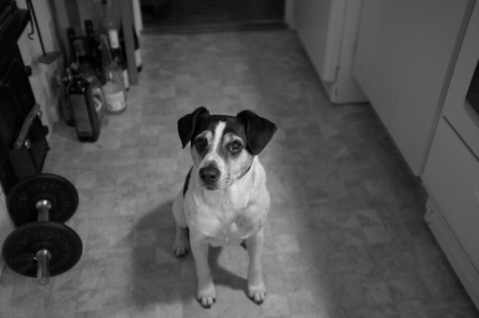 Såg Roffe i ögonvrån när jag stod och diskade i kväll! Och jag vet mycket väl varför han sitter och tittar på mig, för han vill ha mera av den tandrengöringsgodsak som han fick nyss!