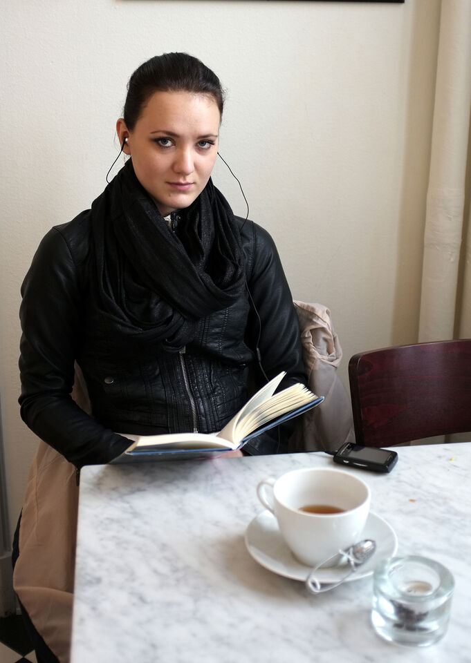 Porträtt på kafé med X100