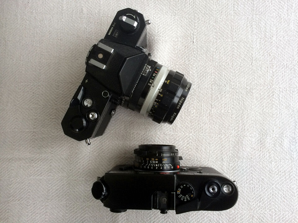 Gårdagens kameror! Båda kamerorna har en optik på 2/35 mm! Den ena optiken sitter på en SLR-kamera, den andra optiken sitter på en mätsökarkamera!