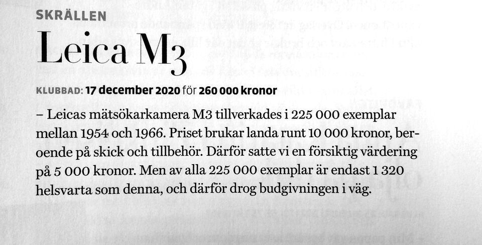 Fick en auktionskatalog i brevlådan från Auctionet! Om det här stämmer, så är det en bra historia! Och varför e en svartmålad M Leica så dyr! Jo, den tillverkades i en ganska liten serie, för svarta ... läs mer..