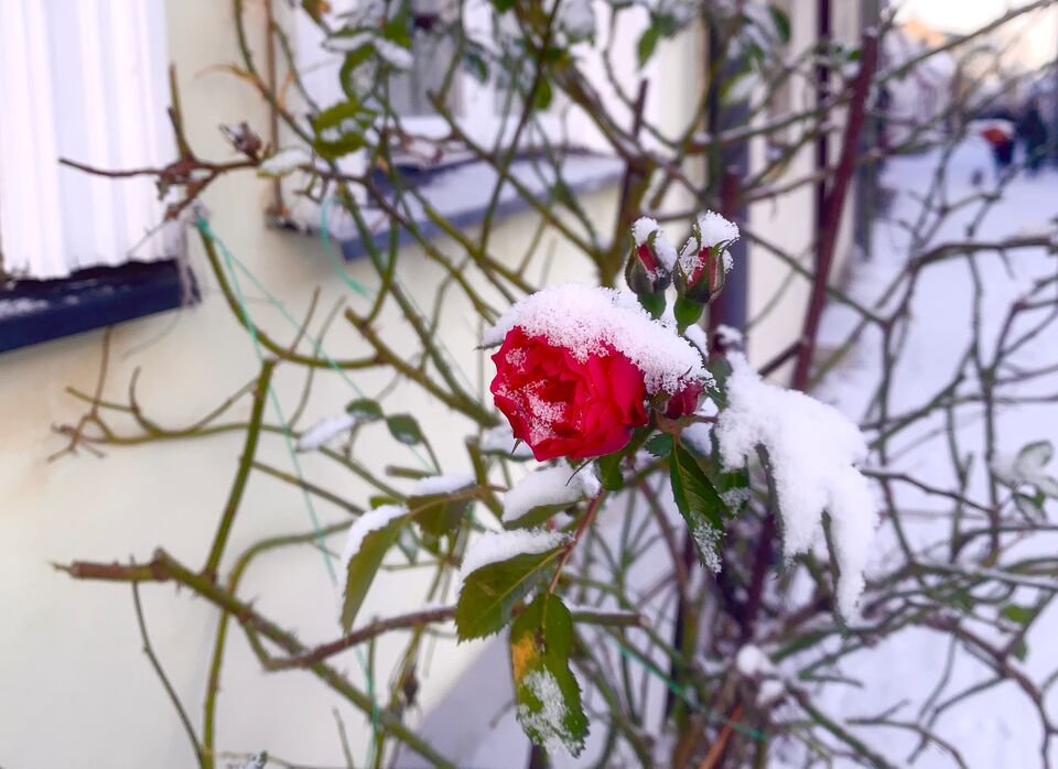 Snön kom till Visby i natt så en kvarvarande ros fick en huvudbonad!
